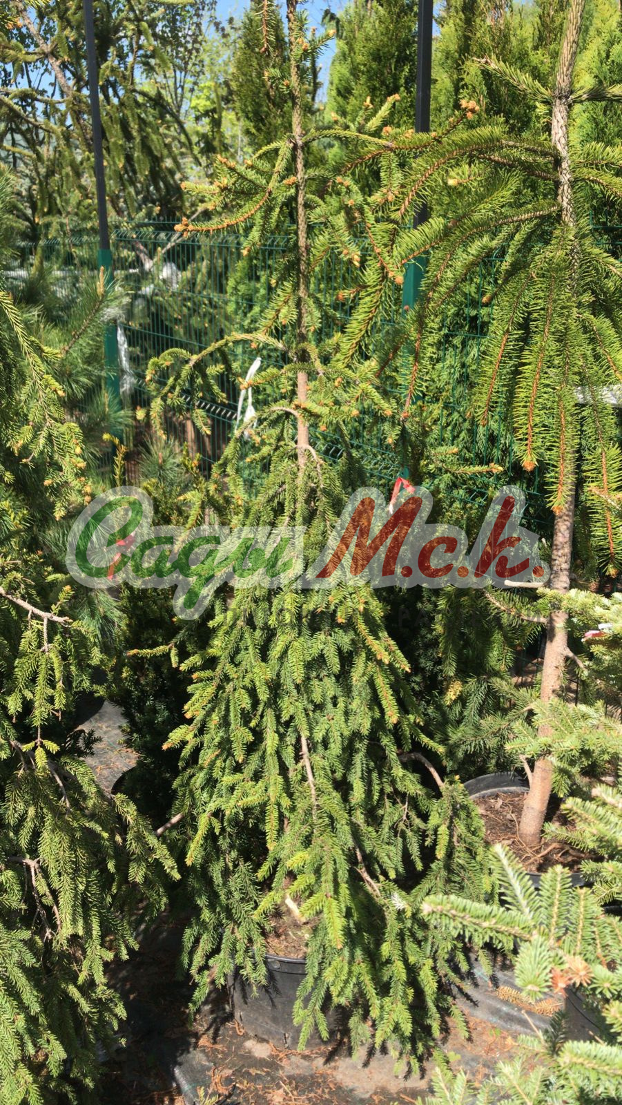 Медленно-растущее хвойное дерево с плакучей колоновидной формой кроны. Ветви и побеги повислые, ниспадающие вниз, нижние ветви красиво распластаны шлейфом по земле. Верхушка имеет заваливающийся характер роста.