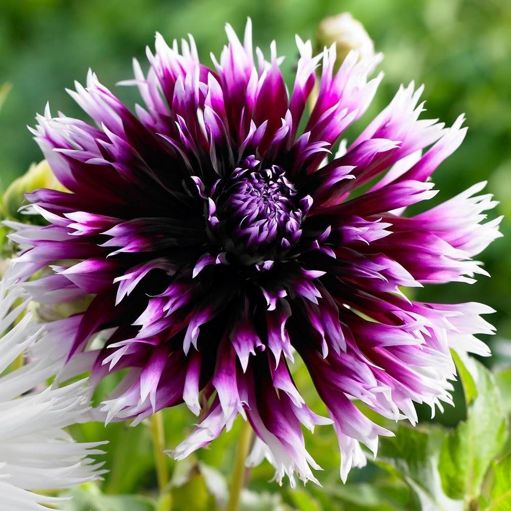 Георгина бахромчатая Алауна Клер Обскюр - насыщенно-пурпурные у основания соцветия, светлующие по мере приближения к белому бахромчатому кончику.