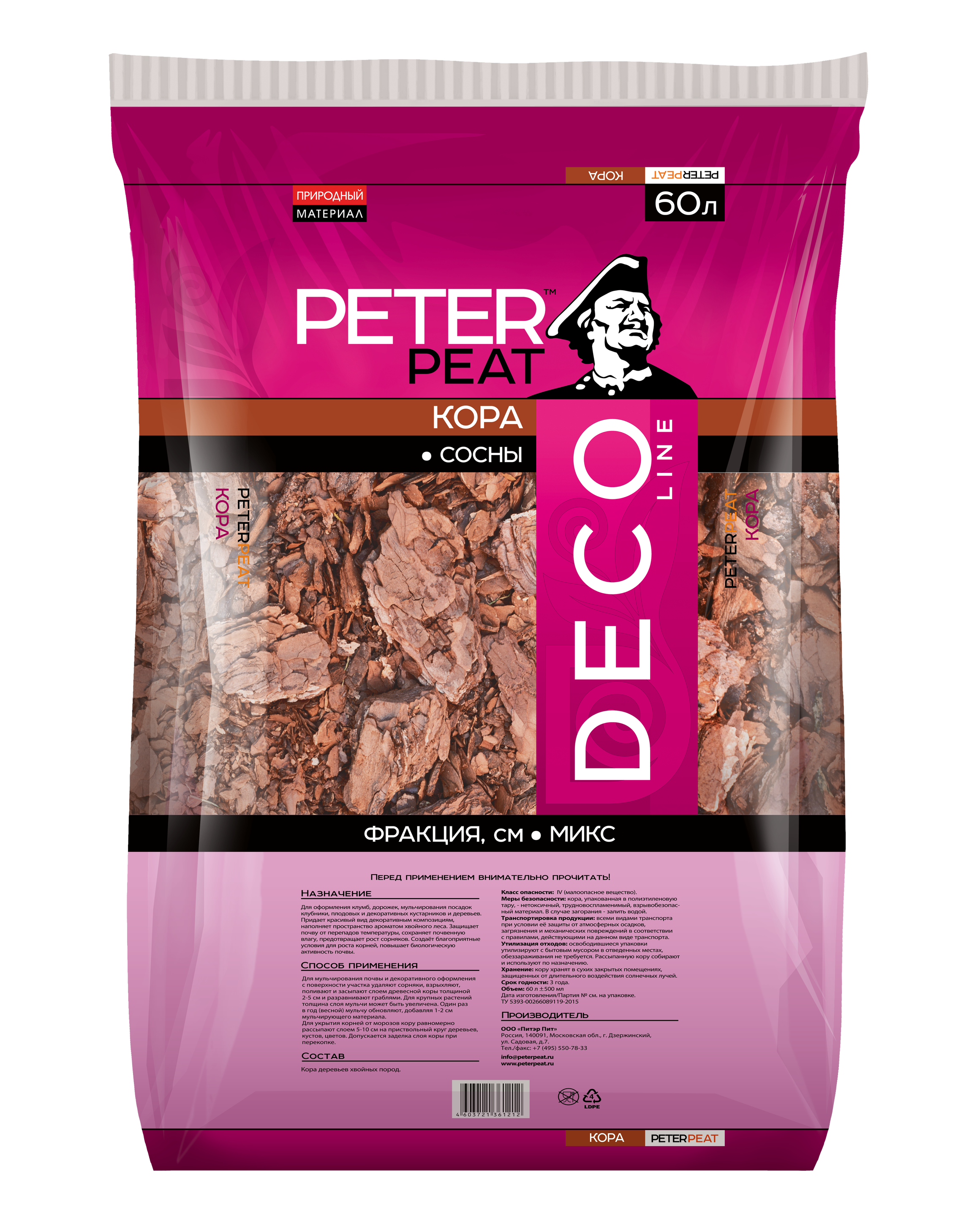 Кора сосновая (фракция Микс, линия Деко) 60 л - природные материалы для декорирования. Защищает почву от перепадов температуры, сохраняет почвенную влагу, снижает количесво сорняков. Придает декоративным композициям красивый вид и наполняет пространство ароматом соснового леса.
