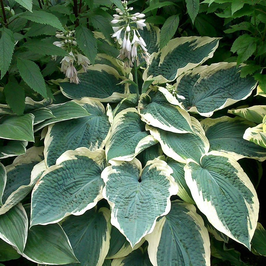 Хоста гибридная Нозерн Икспожэ порадует любого цветовода, который найдет у себя место для высадки этого достаточно крупного растения. Благодаря большим размерам и пестрой окраске листьев эта хоста привлекает к себе внимание даже несмотря на расположение в притененной части сада. Листья крупные, сердцевидно-овальной формы, с хорошо различимыми жилками, несколько морщинистые. Листовая пластина у Хосты гибридной Нозерн Икспожэ (Northern Exposure) имеет зеленовато голубой цвет в центре и желто-зеленую кайму по краям, которая к концу лета обычно меняет цвет на белый или кремовый.