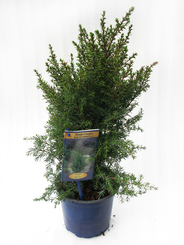 Можжевельник обыкновенный Хиберника - изящный кустарник с узкой колонновидной кроной. Диаметр кроны взрослого растения: 1 м Высота взрослого растения: 3.5 м Форма: Крона колонновидная, густая. Хвоя/Листва: Игольчатая, заостренная, но не колючая, сизовато-зеленая. Требования: Предпочитает солнечные места. К почве и влаге нетребователен. Морозостоек.